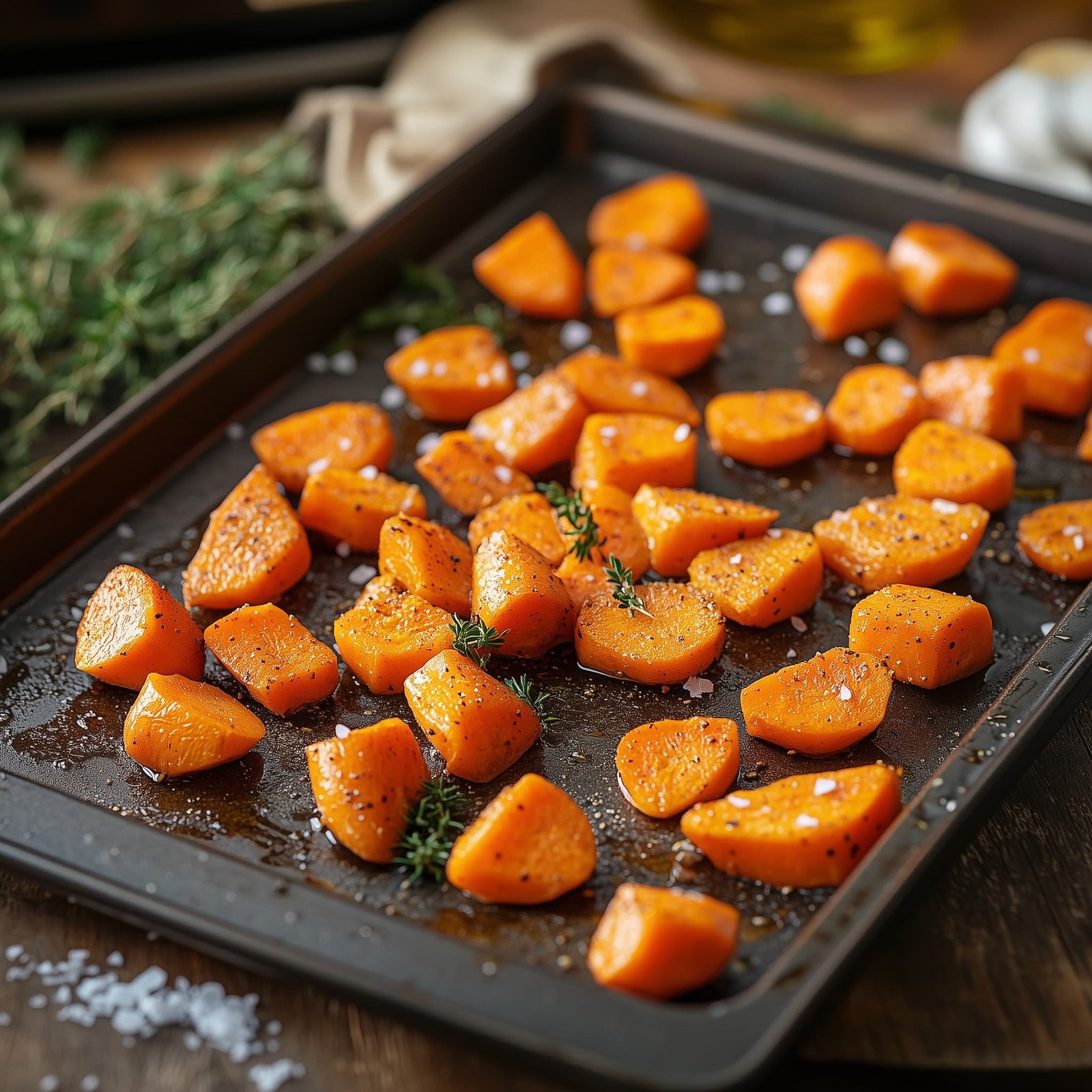 - Coloca las zanahorias en una bandeja para hornear y mézclalas con 1 cucharada de aceite de oliva, sal y pimienta.