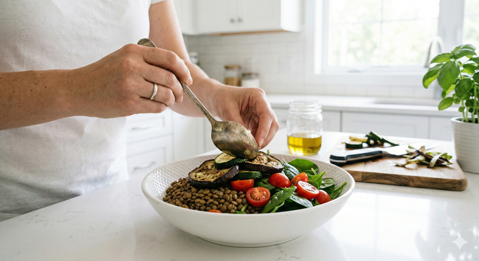 Este bowl mediterráneo antiinflamatorio combina lentejas ricas en fibra y proteína vegetal, berenjena y calabacín asados con aceite de oliva extra virgen, espinaca fresca y un aderezo con cúrcuma y limón que potencia su efecto antiinflamatorio. Es una opción equilibrada que ayuda a mantener la saciedad, estabilizar la energía y apoyar la salud digestiva. Perfecto para un almuerzo ligero pero completo o una cena nutritiva sin sensación de pesadez.