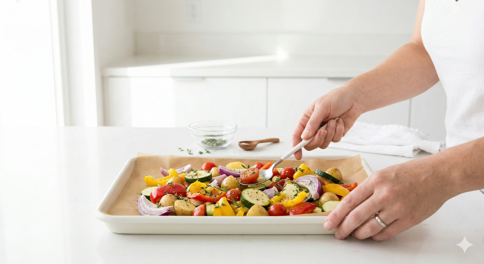 Si los vegetales están muy juntos, se cocinarán al vapor en lugar de asarse. Déjalos con espacio para lograr textura caramelizada.