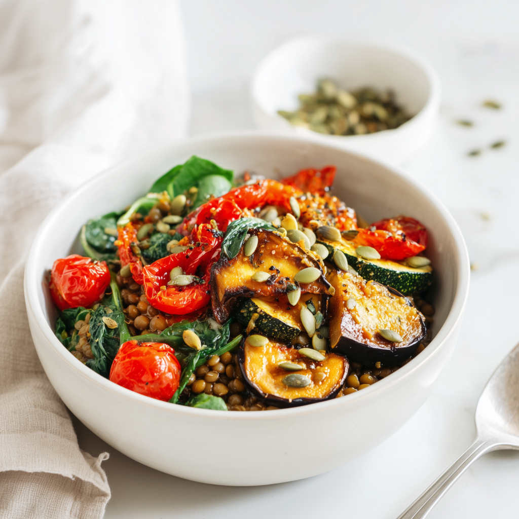 Bowl Mediterráneo Antiinflamatorio con Lentejas y Vegetales Asados