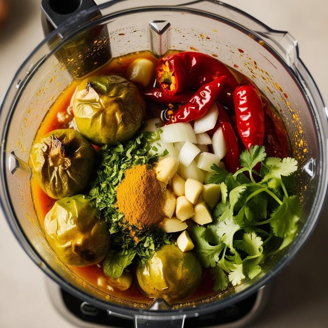 • Licúa con el cilantro, la cúrcuma, sal, pimienta y el aceite de oliva hasta obtener una salsa homogénea.