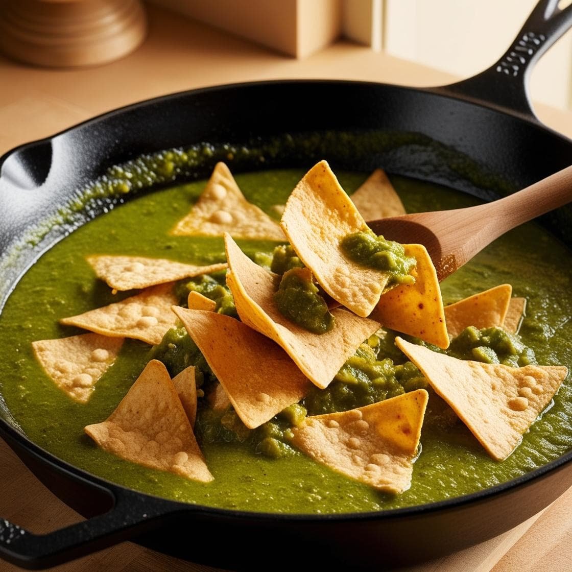 • Cocina por 2-3 minutos, moviendo suavemente para que los totopos absorban la salsa sin deshacerse.