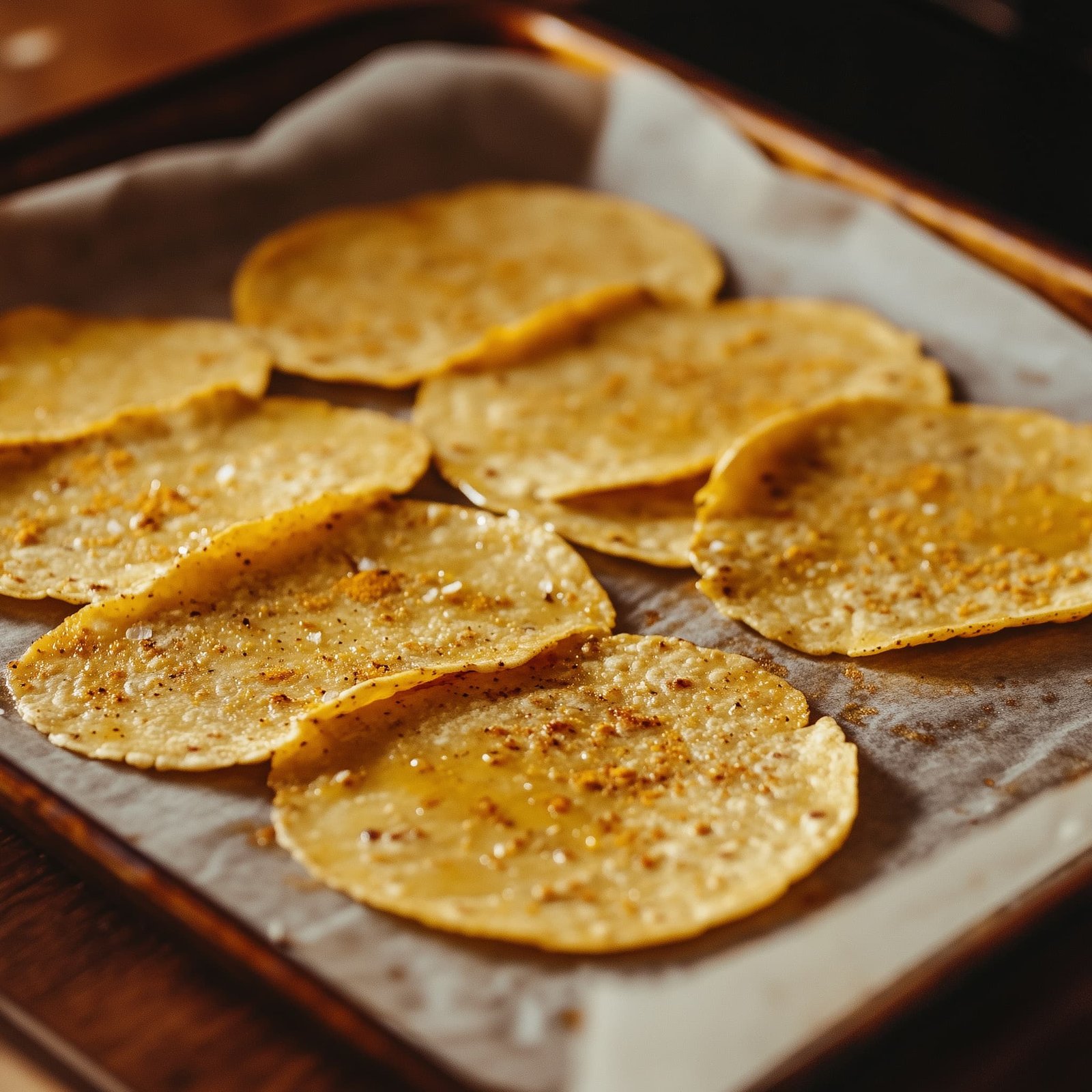 • Coloca los totopos en una bandeja con papel encerado y hornea durante 10-12 minutos o hasta que estén dorados y crujientes.