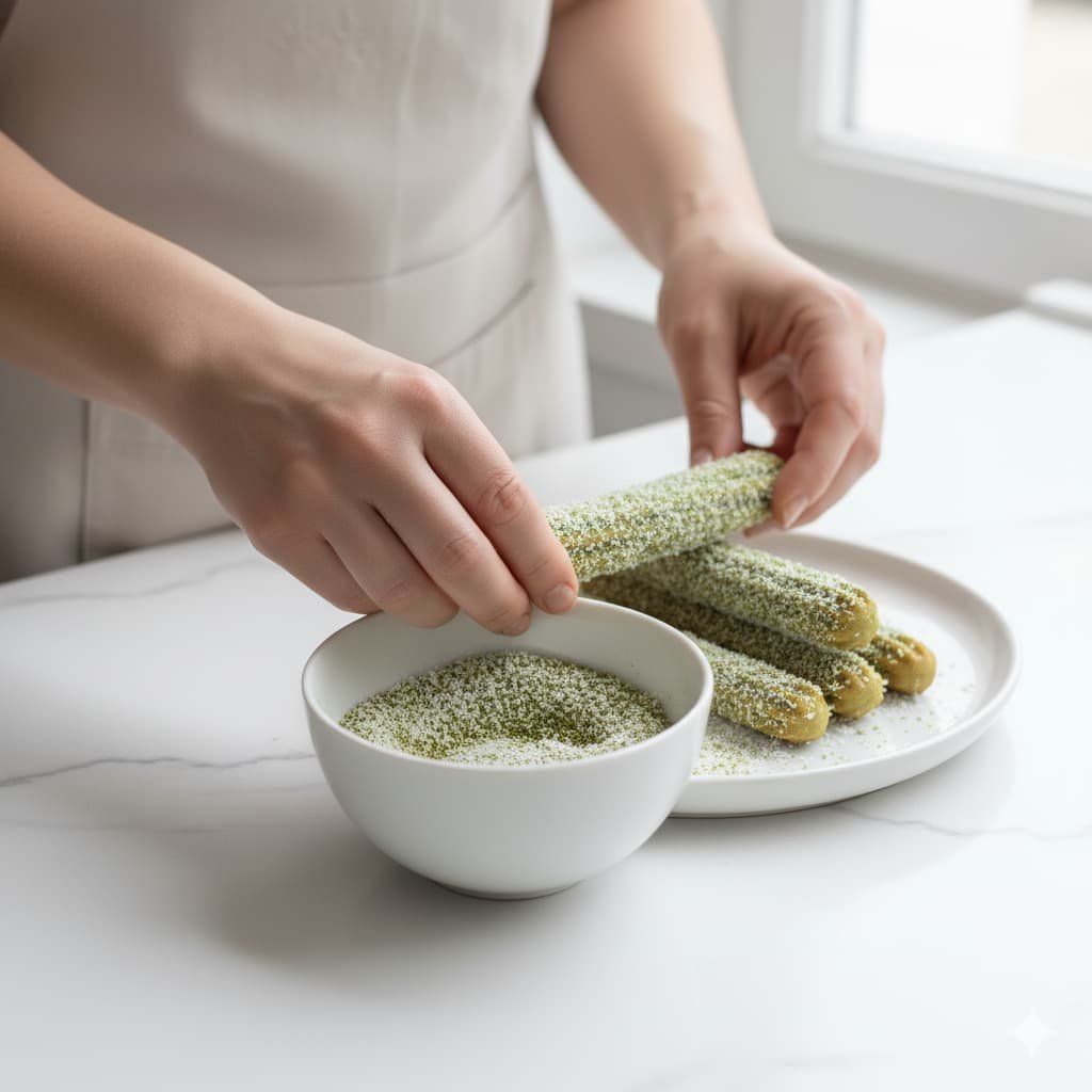 Con los churros aún tibios, pásalos por un poco de coco rallado o endulzante granulado con matcha extra.