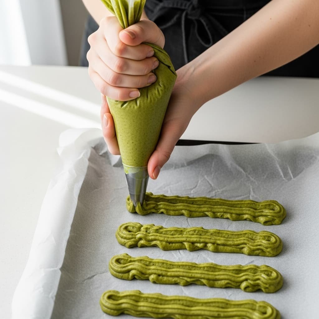 Coloca la masa en una manga pastelera con boquilla estrellada y forma tiras sobre una bandeja o sartén.