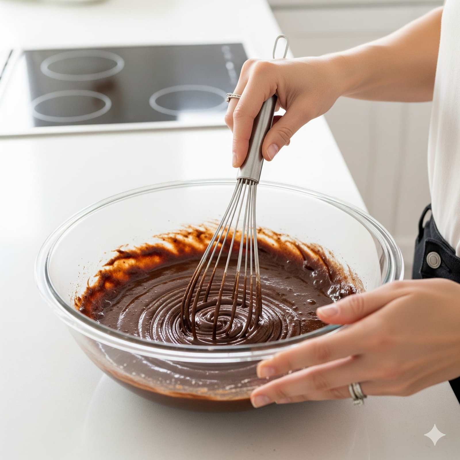 En un bol, combina la harina integral, cacao en polvo y sal. Añade la bebida vegetal, el sirope de arce y la vainilla, mezclando con batidor de globo hasta obtener una masa ligera y sin grumos.