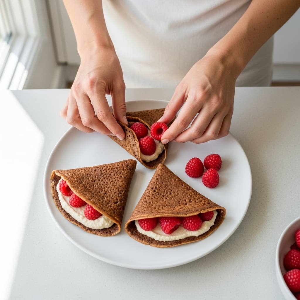 Rellena cada crêpe con la ricotta de almendra, agrega frambuesas frescas y enrolla o dobla en triángulos.