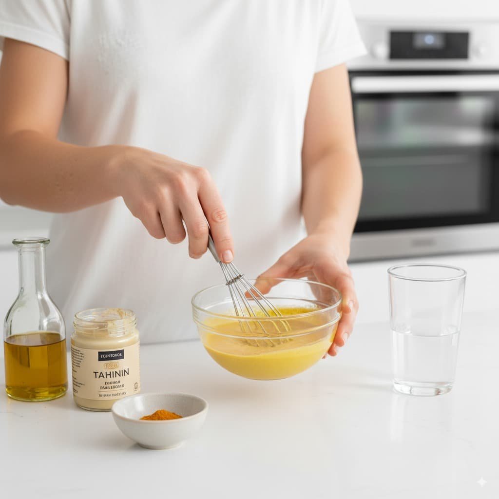 Prepara el aliño batiendo el tahini, aceite de oliva, cúrcuma y un poco de agua si es necesario para aligerar la textura.