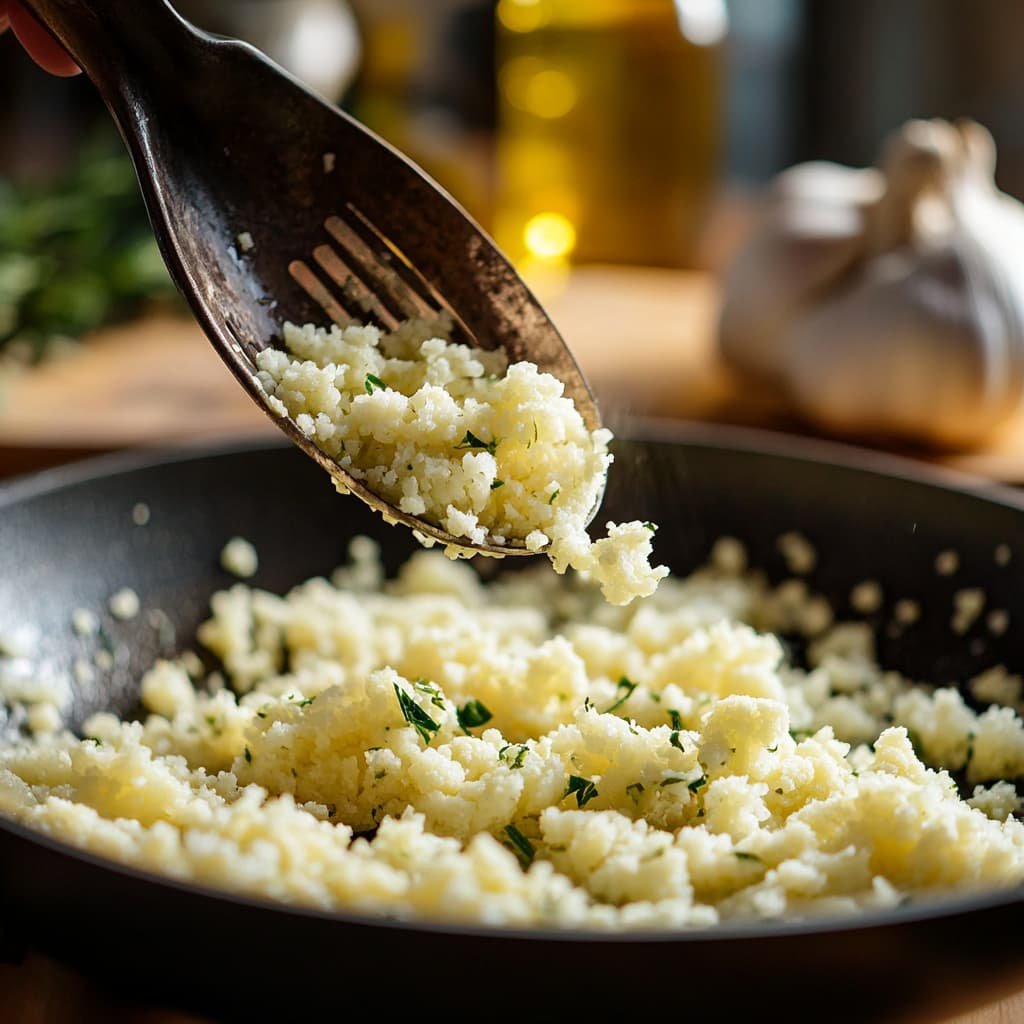 En una sartén con aceite de oliva, sofríe el ajo y luego agrega la coliflor rallada. Cocina por 5-7 minutos a fuego medio. Salpimienta al gusto.