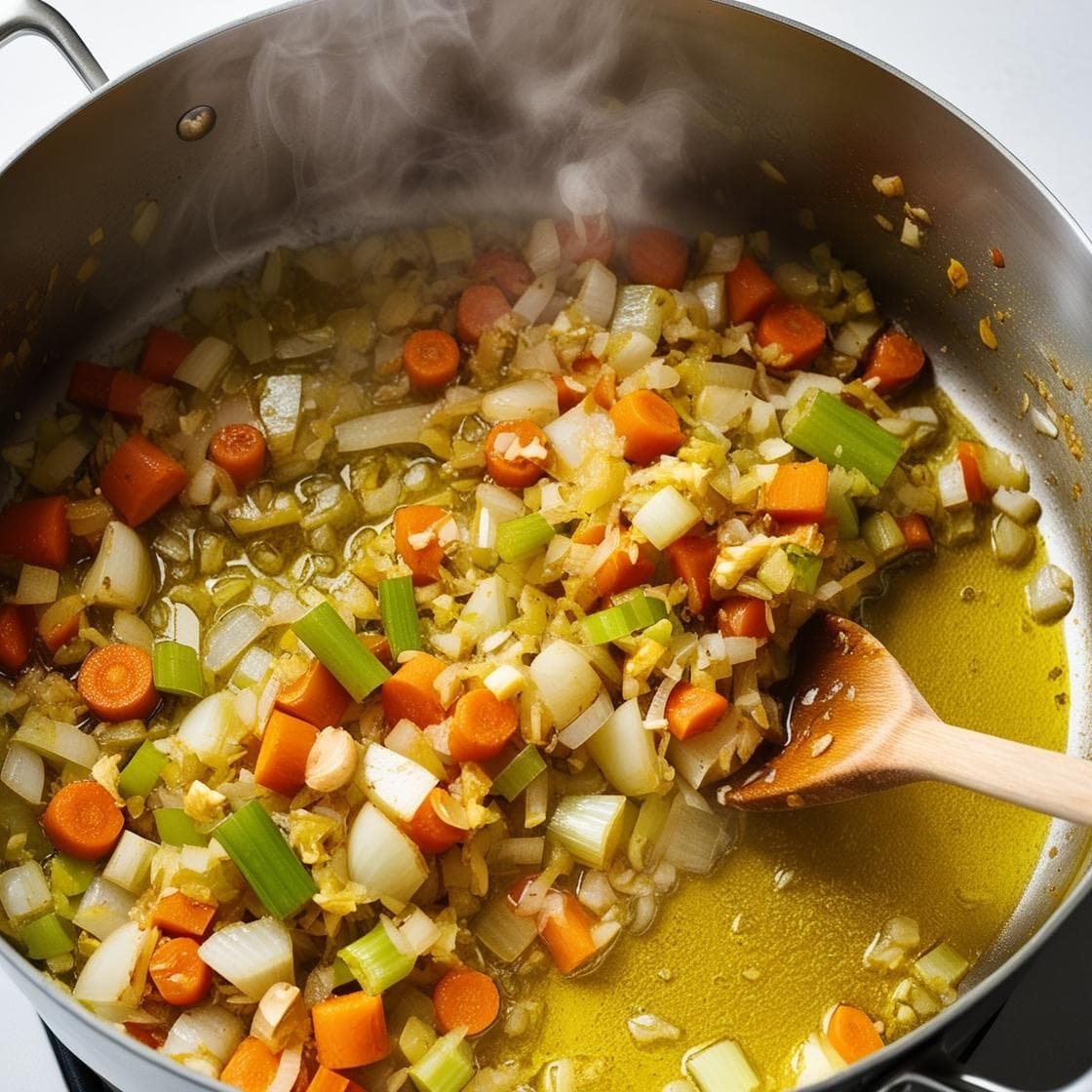 En una olla grande, calienta el aceite de oliva. Agrega la cebolla, el ajo, la zanahoria y el apio. Cocina a fuego medio por unos 5-7 minutos, hasta que la cebolla esté transparente.