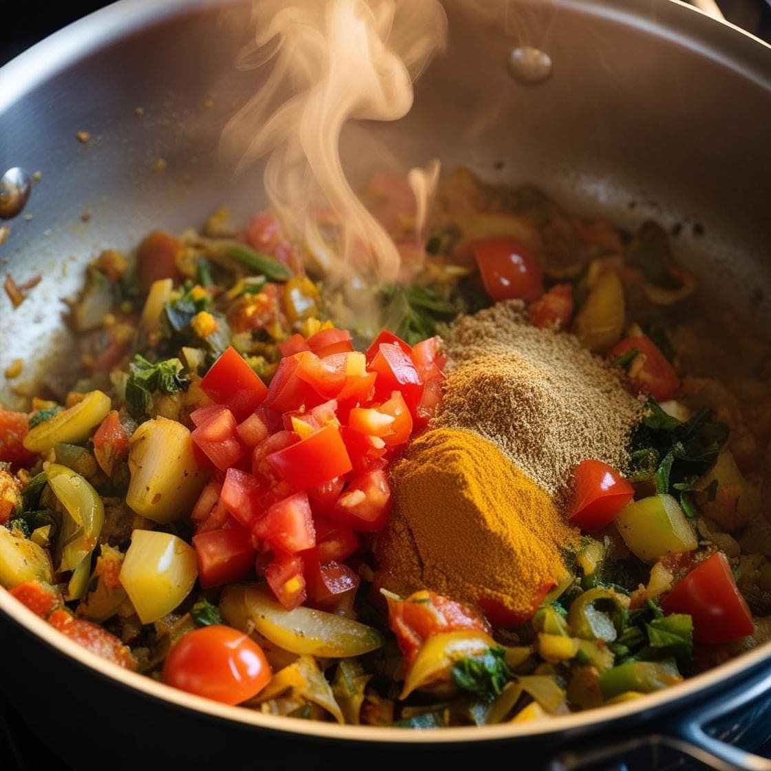 Incorpora el comino, la cúrcuma y el tomate. Cocina por 2-3 minutos más, removiendo constantemente.