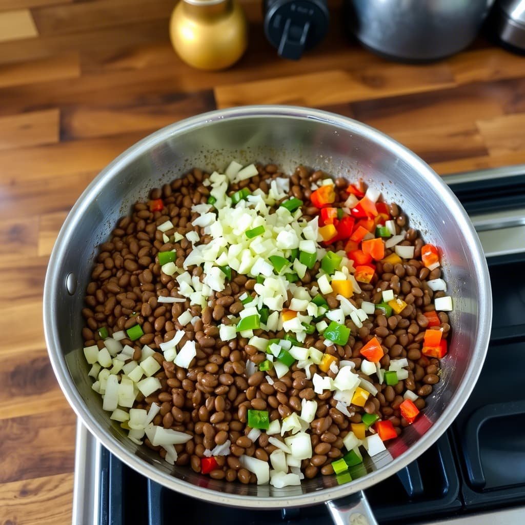 Calienta el aceite y saltea la cebolla, ajo y pimiento por 3-4 minutos. Agrega las lentejas, comino, pimentón y salsa de soya. Cocina por 5-7 minutos, mezcla bien.